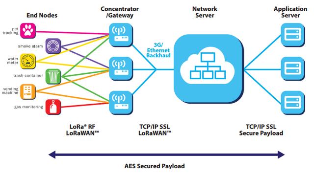LoRaWA使用两层安全模型:一个为网络安全,一个为应用安全。网络安全是为了保证网络中节点的认证,而应用安全重点保护用户应用数据,它采用AES加密算法。